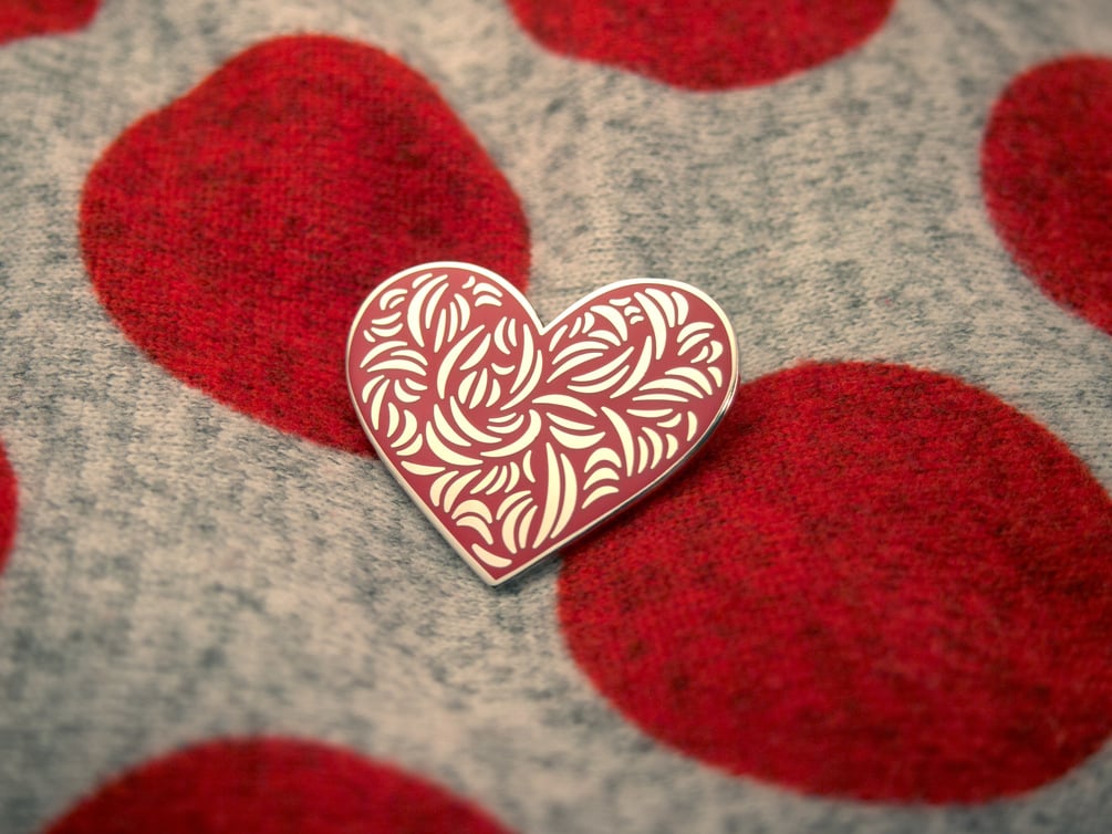 Silver metal with red enamel heart-shaped pin design. The pin is hard enamel measuring 1.5" wide x 1.25" high with double pin posts at the back, and rubber clutches.